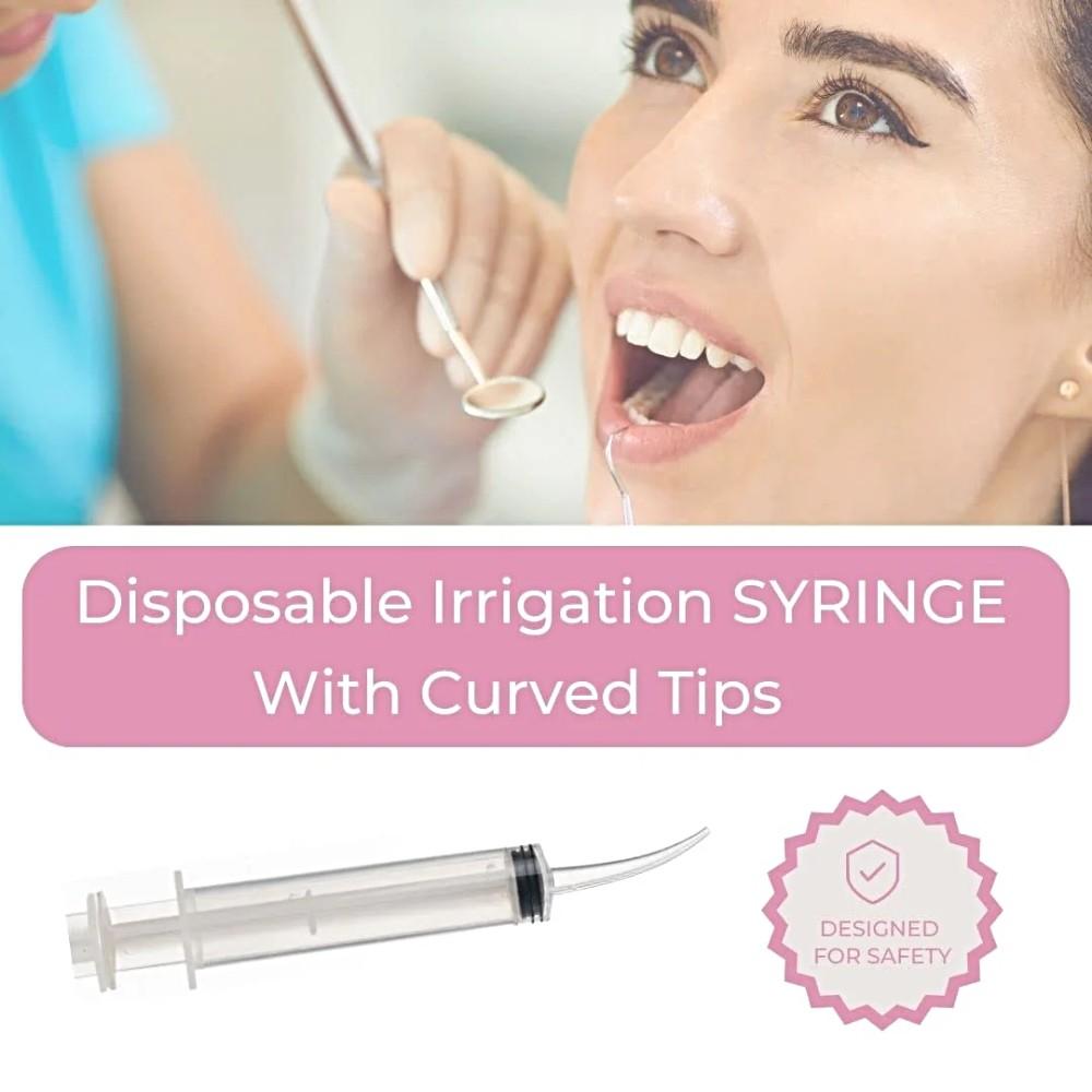 This Utility Syringe has a curved tip for surgical site irrigation and post-surgical irrigation at home. The 12cc syringe is disposable and can be used with silicone and rubber-based impression materials.
