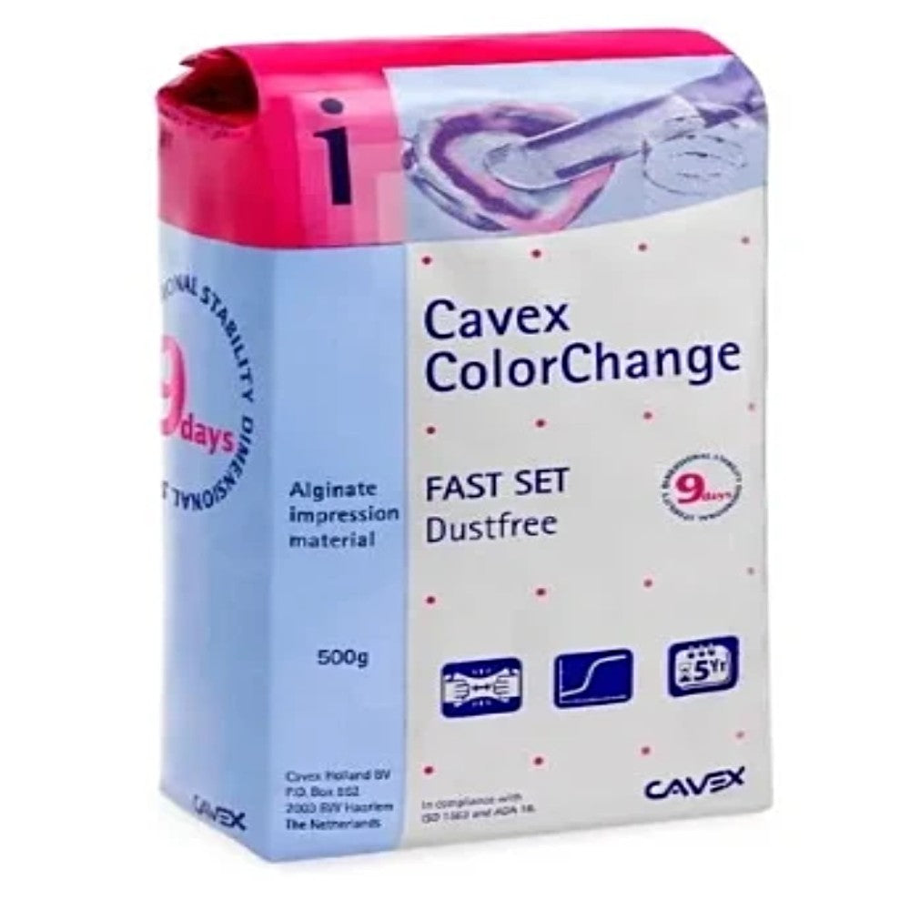 Cavex ColorChange is a fast set alginate, which features a functional colour change system, is highly elastic and tear-resistant, rendering impressive detail of 25μm. Because of its unrivalled balance, this unique, modern alginate has a dimensional stability of at least 9 days.