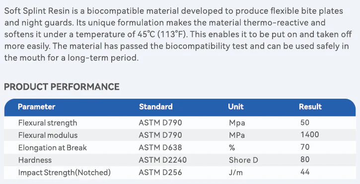 Create flexible and comfortable soft splints with our specialized resin. Ideal for TMJ splints, night guards, and other oral appliances, this resin provides cushioning and protection for patients.