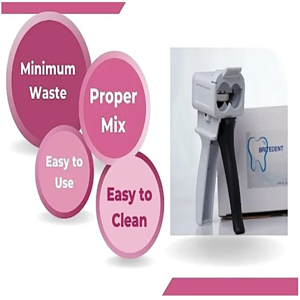 The dispensing gun is used to extrude impression materials and bite registration materials from cartridges. It consists of a release lever and a plunger, which are coordinated simultaneously to load and remove the cartridge. The gun also consists of a trigger to dispense the material.
